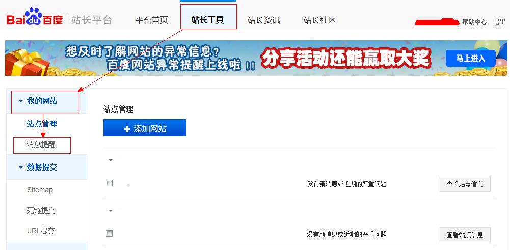 進入百度站長工具,你會發(fā)現(xiàn)在左邊的“我的網(wǎng)站”下除了“站點管理”之外又多了一個“消息提醒”而這個就是百度異常提醒的工具