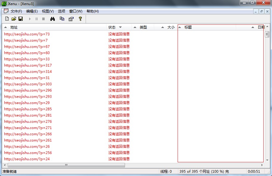 這個截圖是我點(diǎn)擊上面的“狀態(tài)”之后展現(xiàn)的結(jié)果,因為點(diǎn)擊“狀態(tài)”之后它會自動進(jìn)行排序,這樣我們就能一目了然的看到這些信息。大家應(yīng)該注意到我最后畫了一個紅色的框,這個是“標(biāo)題”的區(qū)域,如果我們網(wǎng)站指向別人的外部鏈接是死鏈的話,這里就是說明哪些鏈接以及錨文字之類的。