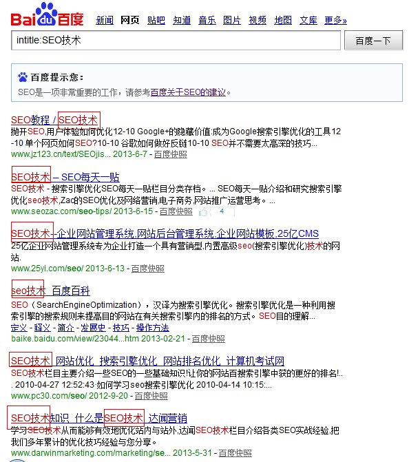intitle指令是指頁面標題包含此詞匯信息的展現(xiàn)結果,我們都知道標題是整個網(wǎng)站寸土寸金的地方,而通過intitle查詢出來的結果,能夠更精準的找到我們的競爭對手。我們還是以”SEO技術”為例,進行查詢,