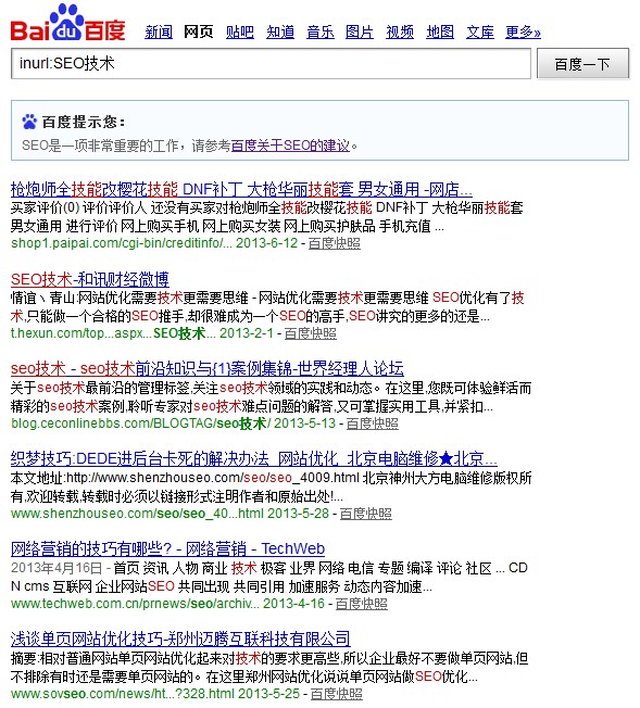 inurl指令的作用是搜索我們查詢的詞匯,出現(xiàn)在url中的結果,不僅百度和谷歌支持,還支持中文和英文。但是曾經(jīng)是準確的,如今無論百度還是谷歌,無論是英文還是中文,都不是那么準確了。例如我們搜索“SEO技術”,搜索出來的結果就會出現(xiàn)URL中包含“SEO技術”的信息,如圖: