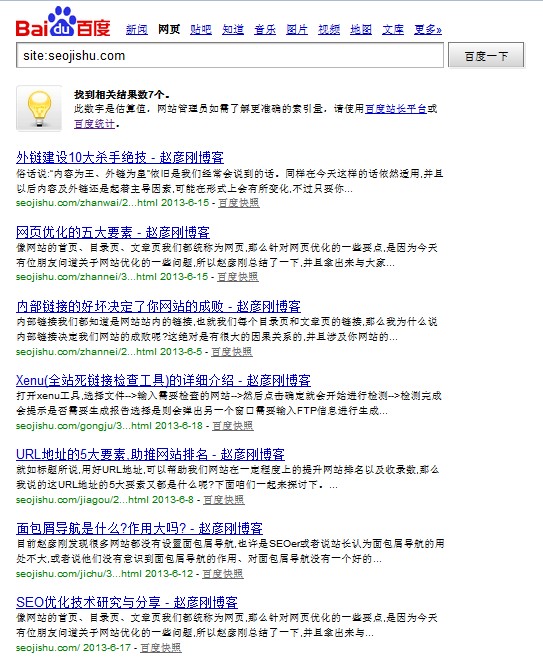 在百度搜索引擎輸入site:seojishucom展現(xiàn)的結果