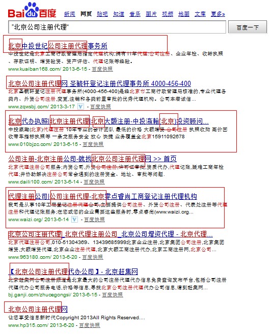 通過上圖我們可以看到雙引號搜索出來的結果,并不是完全匹配,而只要包含這些公司的所有網(wǎng)站標題都會被展現(xiàn)出來。